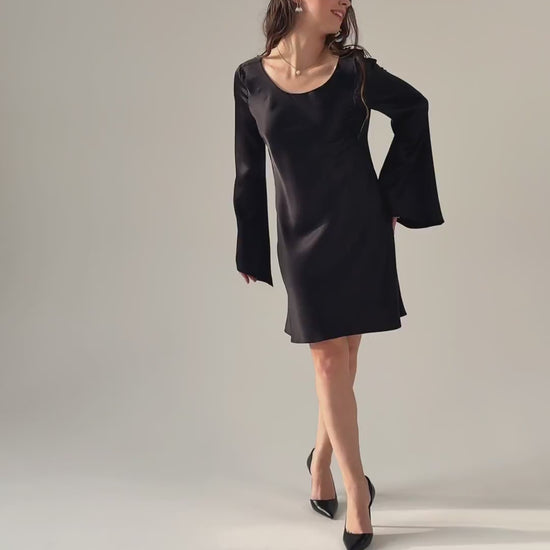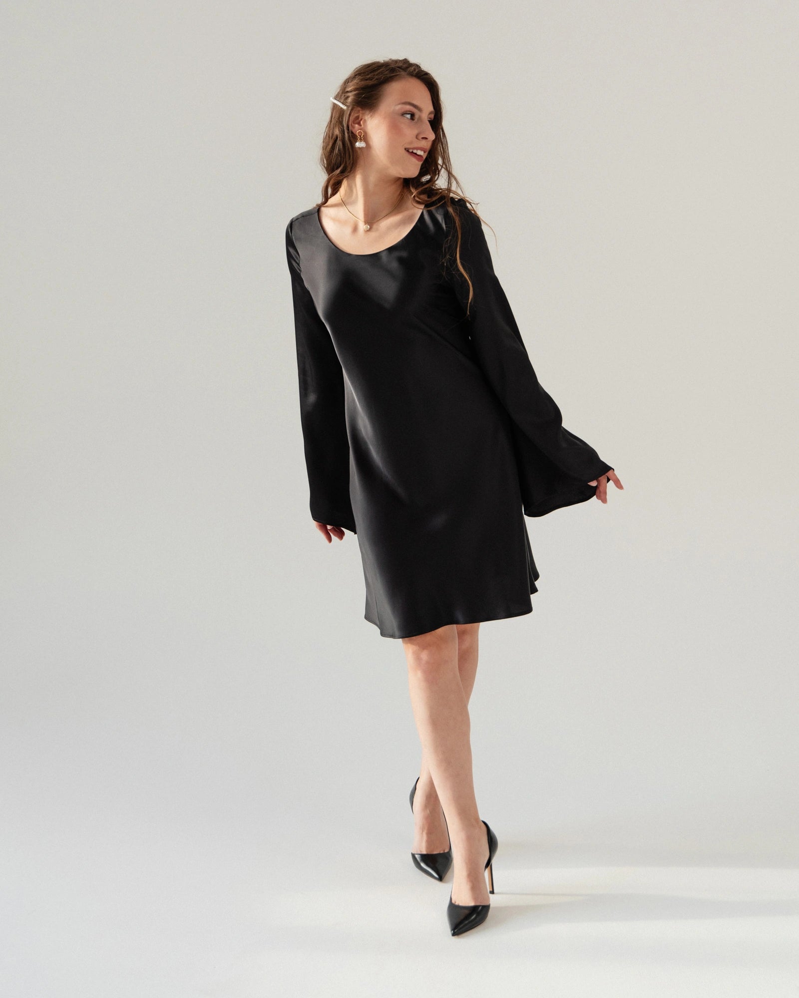 Średniej długości, elegancka sukienka o prostym, ponadczasowym kroju. Delikatny połysk materiału, dopracowana linia ramion i długi rękaw nadają jej kobiecej lekkości. Idealna zarówno na co dzień, jak i na wyjątkowe okazje.