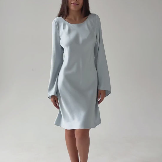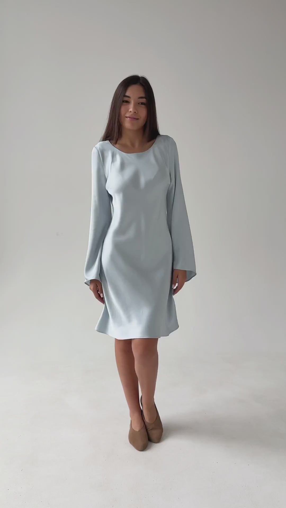 Średniej długości, elegancka sukienka o prostym, ponadczasowym kroju. Delikatny połysk materiału, dopracowana linia ramion i długi rękaw nadają jej kobiecej lekkości. Idealna zarówno na co dzień, jak i na wyjątkowe okazje.